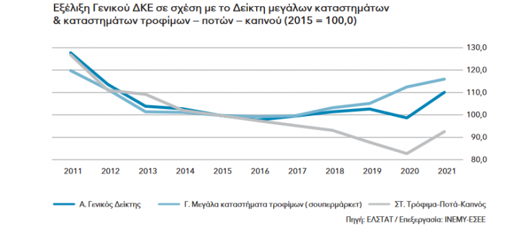 Είναι χαρακτηριστικό ότι οι σωρευτικές απώλειες της περιόδου 2011-2021 για τα σούπερ μάρκετ ανέρχονται μόλις στο -3,1%. Την ίδια στιγμή, τα μικρότερα καταστήματα τροφίμων έχουν απολέσει το -27% των πωλήσεών τους, στοιχείο το οποίο υπογραμμίζει τον δυϊσμό μεγέθους στον κρίσιμο κλάδο των τροφίμων.