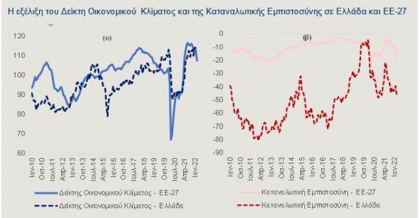 Επιπρόσθετα, ο Δείκτης Οικονομικού Κλίματος σημείωσε πτώση, στις 24 από τις 27 χώρες της ΕΕ, μεταξύ Ιανουαρίου και Μαρτίου 2022. Από τις επιμέρους συνιστώσες του δείκτη, τις μεγαλύτερες πτώσεις στο ίδιο χρονικό διάστημα, κατά μέσο όρο στην ΕΕ-27, κατέγραψαν η καταναλωτική εμπιστοσύνη και η βιομηχανία. Στην Ελλάδα, ο Δείκτης Οικονομικού Κλίματος διαμορφώθηκε, τον Μάρτιο, σε 113,2 μονάδες από 114,2 μονάδες, τον Ιανουάριο (Γράφημα 3α), που ήταν η υψηλότερη τιμή του από τον Δεκέμβριο του 2000. Η υποχώρηση του δείκτη προήλθε κυρίως από την πτώση της καταναλωτικής εμπιστοσύνης, κατά 4,3 μονάδες, καθώς επανήλθε περίπου στο επίπεδο του Νοεμβρίου του 2020, μήνας κατά τον οποίο επιβλήθηκαν εκ νέου μέτρα περιορισμού της οικονομικής δραστηριότητας, καθώς το δεύτερο κύμα της πανδημίας Covid-19 ήταν σε εξέλιξη. Αντίθετα, άνοδο σημείωσαν οι επιχειρηματικές προσδοκίες στις κατασκευές, στην Ελλάδα, τον Μάρτιο, σε σύγκριση με τον Ιανουάριο. Οι εκτιμήσεις των καταναλωτών για την τρέχουσα οικονομική κατάστασή τους, αλλά και για την εξέλιξή της το επόμενο δωδεκάμηνο, ήταν οι δύο από τις μεταβλητές του δείκτη καταναλωτικής εμπιστοσύνης που πρωτίστως οδήγησαν στην πτώση του, στο διάστημα Φεβρουαρίου-Μαρτίου 2022.