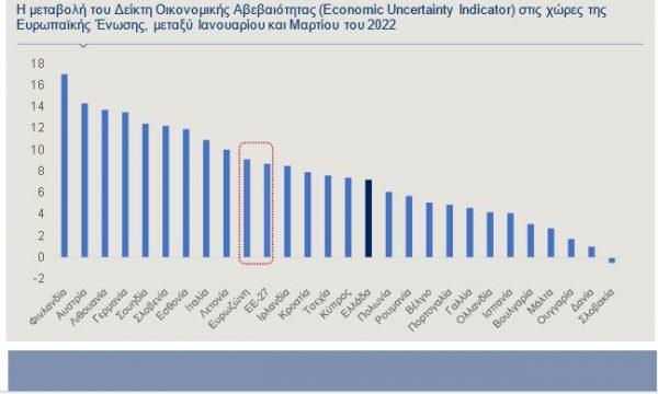 Πιο αναλυτικά, ο Δείκτης Οικονομικής Αβεβαιότητας αυξήθηκε αισθητά στις ευρωπαϊκές χώρες, τον Μάρτιο σε σύγκριση με τον Ιανουάριο, εξαιτίας του πολέμου στην Ουκρανία και της αβεβαιότητας που απορρέει για τη μελλοντική οικονομική κατάσταση επιχειρήσεων και καταναλωτών, με τις μεγαλύτερες αυξήσεις να έχουν σημειωθεί σε Φινλανδία (17 μονάδες), Αυστρία (14,3 μονάδες), Λιθουανία (13,7 μονάδες) αλλά και στη Γερμανία (13,5 μονάδες). Στη χώρα μας, η αύξηση, αν και αξιοσημείωτη, ήταν ελαφρώς ηπιότερη από τον μέσο όρο της ΕΕ-27 (8,7 μονάδες), καθώς ανήλθε σε 7,2 μονάδες.