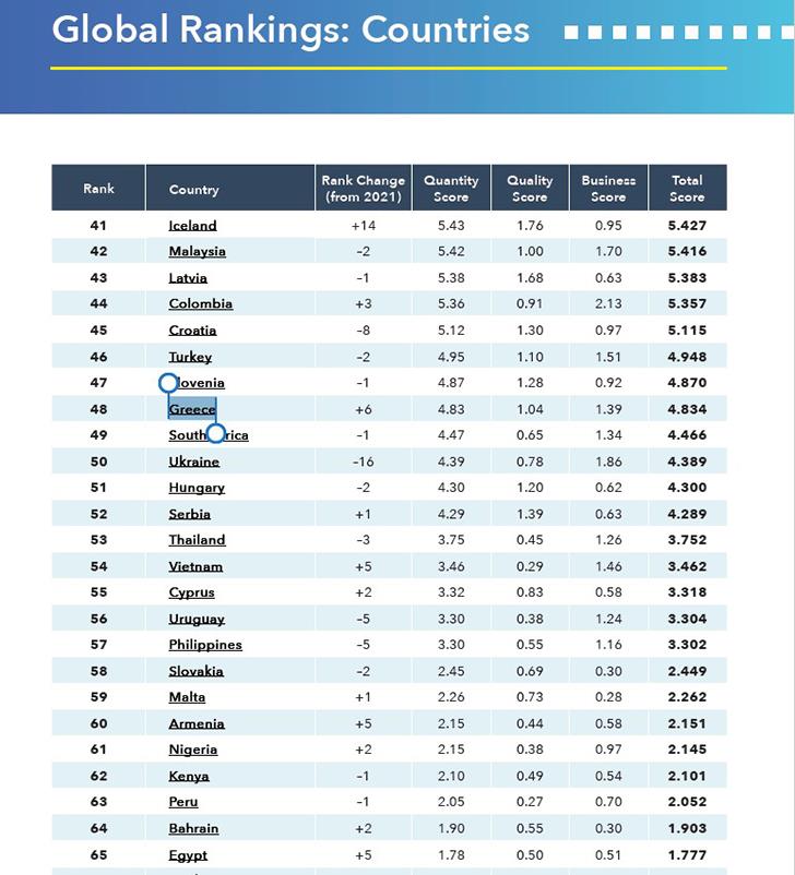 Καλύτερες επιδόσεις από την Ελλάδα στην παγκόσμια κατάταξη καταγράφουν για το 2022 η Ισπανία (στη 16η θέση), η Πορτογαλία (στην 28η), η Ιταλία (31η), αλλά και η Τσεχία (32η), η Ρουμανία (39η), η Βουλγαρία (36η), η Τουρκία (46η) και η Σλοβενία (47η).