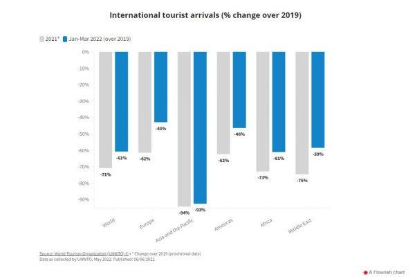 Τα στοιχεία του UNWTO δείχνουν ότι κατά το πρώτο τρίμηνο του 2022, η Ευρώπη υποδέχθηκε σχεδόν τέσσερις φορές περισσότερες διεθνείς αφίξεις (+280%) από ό,τι το 1ο τρίμηνο του 2021, με τα αποτελέσματα να βασίζονται στην ισχυρή ενδοπεριφερειακή ζήτηση. Στην Αμερική οι αφίξεις υπερδιπλασιάστηκαν (+117%) το ίδιο τρίμηνο. Ωστόσο, οι αφίξεις στην Ευρώπη και την Αμερική εξακολουθούν να είναι 43% και 46% χαμηλότερες από τα επίπεδα του 2019 αντίστοιχα.