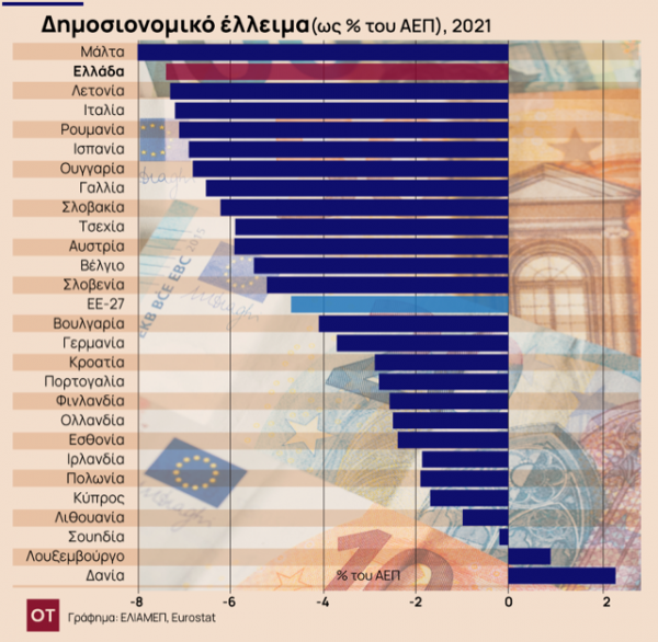 Η Ευρώπη έκλεισε το προηγούμενο έτος με τη συντριπτική πλειοψηφία των κρατών μελών να καταγράφουν δημοσιονομικά ελλείμματα. Μόλις δύο από τις 27 χώρες της ΕΕ (Δανία και Λουξεμβούργο) κατέγραψαν δημοσιονομικά πλεονάσματα, ενώ τα υπόλοιπα 25 μέλη κινήθηκαν σε αρνητικά επίπεδα. Η Ελλάδα σημείωσε το δεύτερο μεγαλύτερο έλλειμμα στην Ευρώπη το οποίο διαμορφώθηκε στο 7,4% του ΑΕΠ της. Την πρωτιά κατέχει η Μάλτα με 8% ενώ η Λετονία, η Ιταλία και η Ρουμανία κινούνται επίσης σε επίπεδα άνω του 7%.