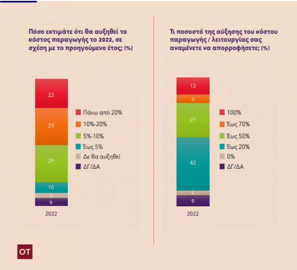 Οι 9 στους 10 Έλληνες επιχειρηματίες δηλώνουν ότι θα αυξηθεί το κόστος παραγωγής τους, ενώ 5 στους 10 ότι θα αυξηθεί σημαντικά, πάνω από 10%.