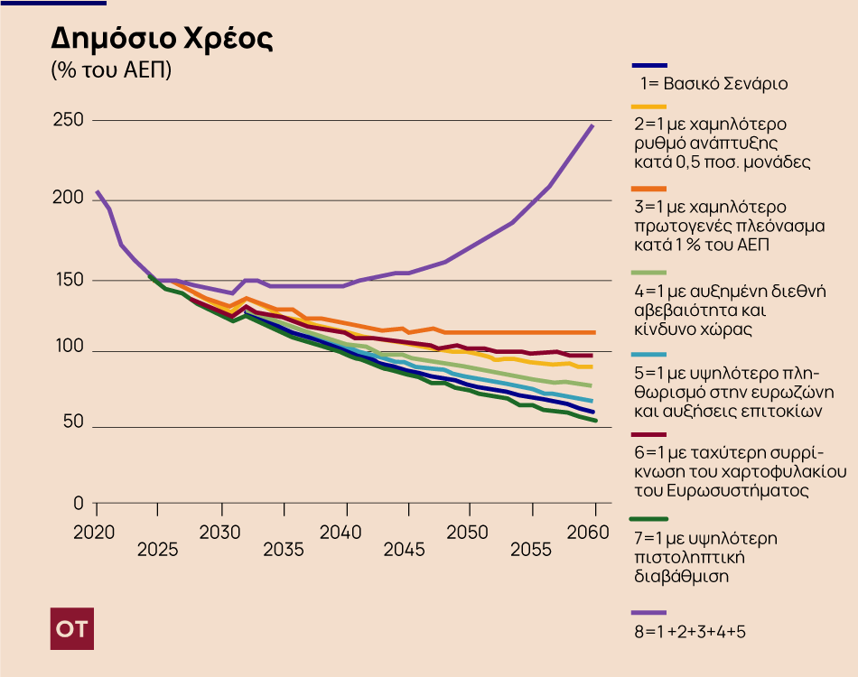 Το βασικό σενάριο υποθέτει επιστροφή σε πρωτογενές πλεόνασμα από το 2023, το οποίο διευρύνεται σε 2,0% του ΑΕΠ το 2025 και διατηρείται μόνιμα σε αυτό το επίπεδο. Γίνεται η υπόθεση ότι ο δημοσιονομικός χώρος από την εκτιμώμενη εξοικονόμηση δαπανών γήρανσης θα αξιοποιηθεί προκειμένου να καταστεί το μίγμα της δημοσιονομικής πολιτικής πιο φιλικό στην ανάπτυξη. Ο λόγος του χρέους προς το ΑΕΠ αναμένεται να διαγράψει διατηρήσιμη τροχιά αποκλιμάκωσης, παραμένοντας ωστόσο μεσοπρόθεσμα άνω του 100% του ΑΕΠ και φθάνοντας το 2060 σε 61% του ΑΕΠ. Οι ακαθάριστες χρηματοδοτικές ανάγκες του Δημοσίου διατηρούνται μεσοπρόθεσμα πλησίον αλλά εντός του ορίου 15% του ΑΕΠ και σε κάθε περίπτωση εντός του μακροπρόθεσμου ορίου βιωσιμότητας 20% του ΑΕΠ.