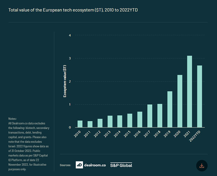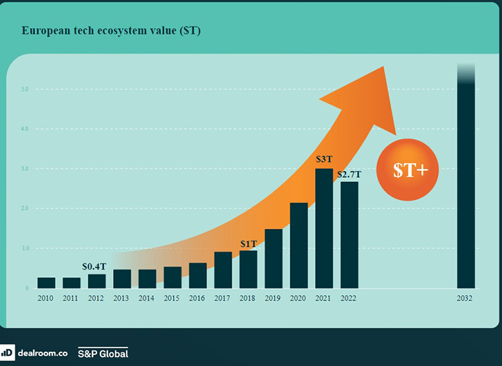 Όπως αναφέρει στο ετήσιο report της η εταιρεία επενδυτικών κεφαλαίων Atomico, αποτιμώντας την αγορά της τεχνολογίας σε 41 χώρες της Ευρώπης, παρά την οπισθοδρόμηση, η συνολική αξία του τεχνολογικού οικοσυστήματος της Ευρώπης έχει αυξηθεί κατά $2 τρισ. από το 2015, με ετήσιο σύνθετο ρυθμό ανάπτυξης (CAGR) 26% μεταξύ 2015-2022.