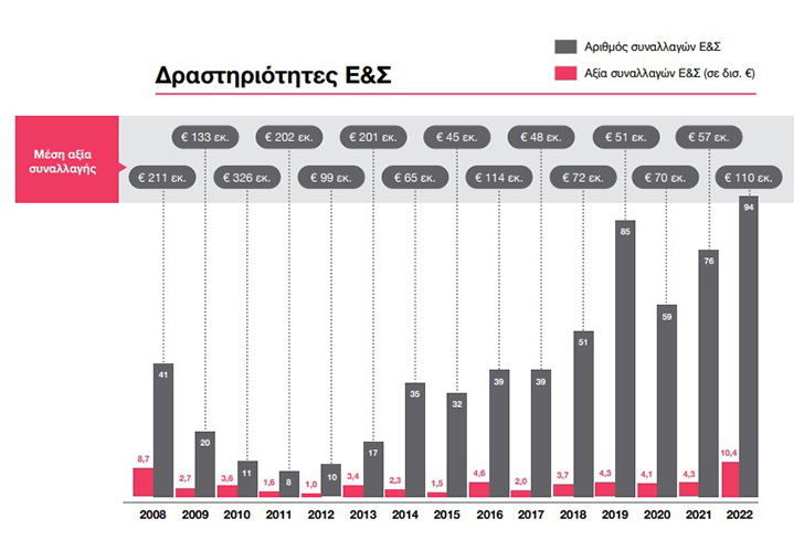 Ενδεικτικό της αλματώδους αύξησης είναι πως μόλις η αξία των πέντε μεγαλύτερων Ε&Σ κατά το 2022 ανήλθε σε €4,25 δισ., που ισοδυναμεί με το σύνολο των Ε&Σ που καταγράφηκαν το 2021. Αντίστοιχα, το μέσο ύψος συναλλαγής ήταν €110 εκατ., ενώ χαρακτηριστικό του νέου τοπίου, που διαμορφώθηκε, είναι ότι το 2022 ο αριθμός των Ε&Σ αυξήθηκε κατά 23,7% σε σύγκριση με το προηγούμενο έτος, ενώ η μέση αξία της κάθε αλλαγής αυξήθηκε κατά €54 εκατ., αντανακλώντας το ενδιαφέρον των επενδυτών για συναλλαγές μεγαλύτερου μεγέθους.