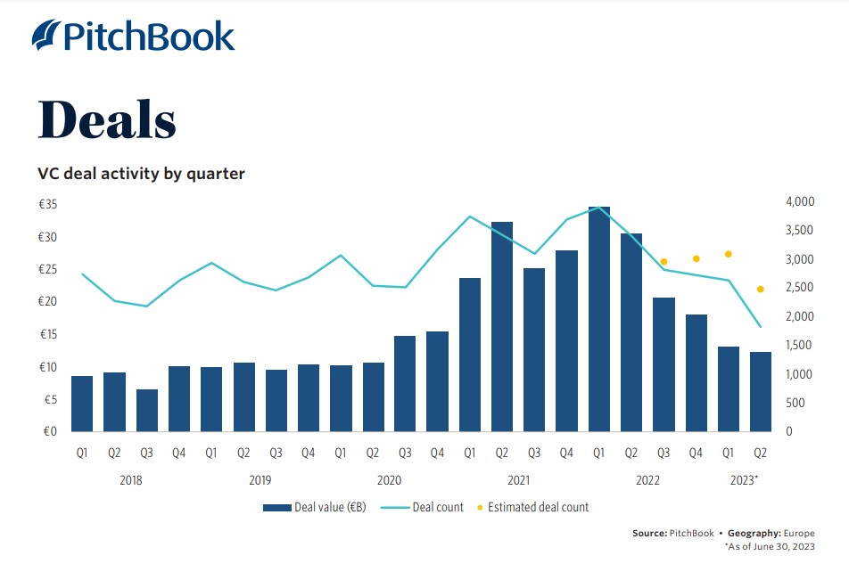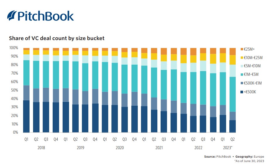 Σύμφωνα με το “European Venture Report 2ο τρίμηνο 2023” της Pichbook, οι χρηματοδοτήσεις VCs προς ευρωπαϊκές νεοφυείς εταιρείες ήταν μειωμένες σε όλα τα στάδια. Για παράδειγμα, οι χρηματοδοτικές συμφωνίες μεταξύ €10 εκατ. έως €25 εκατ. μειώθηκαν κατά 39,1% το 2ο τρίμηνο του 2023. Οι δε συμφωνίες χρηματοδότησης για ποσά από €500.000 έως €1 εκατ. και οι συμφωνίες κάτω των €500.000 μειώθηκαν κατά 65,9% και 64,0% σε ετήσια βάση, αντίστοιχα.