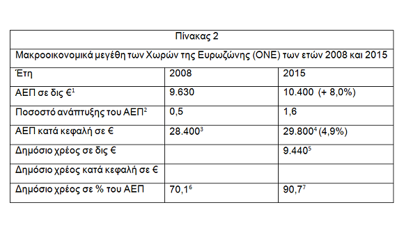 Η ανεργία στην Ελλάδα αυξήθηκε από 7,7% στο 24,1% (2008 - 2015), δηλαδή κατά 237,5%, ενώ η μέση ανεργία των χωρών της ΟΝΕ αυξήθηκε στο διάστημα αυτό από 7,5% στο 10,1% δηλαδή κατά 34,7%.