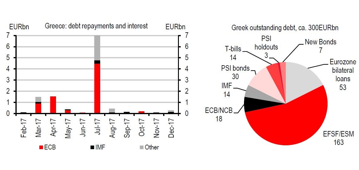Στο αριστερό διάγραμμα βλέπουμε τις οφειλές μέχρι το τέλος του 2017.Με κόκκινο χρώμα είναι αυτές προς την Ευρωπαϊκή Κεντρική Τράπεζα (ΕCB).Γίνεται αντιληπτό ότι αυτές, είναι φέτος οι περισσότερες και ειδικά τον Ιούλιο εκτινάσσονται στα 4,2 δις (οι συνολικές τότε είναι 7 δις). Τόσο πριν όσο και μετά, οι υποχρεώσεις σε μηνιαία βάση είναι σχετικά διαχειρίσιμες.