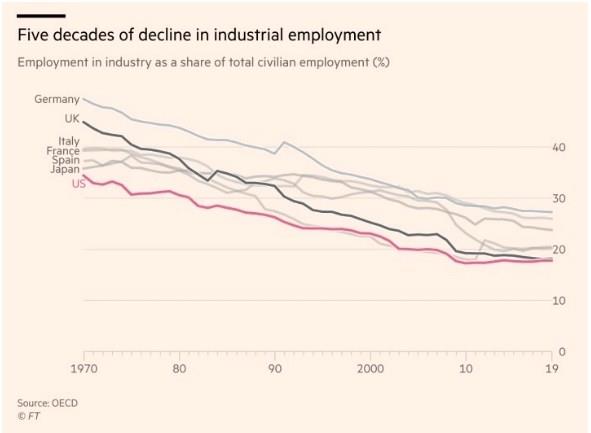Η πτώση της μεταποίησης ως πηγής απασχόλησης είχε δυσμενείς συνέπειες σε πόλεις και περιοχές στις οποίες ήταν συγκεντρωμένες. Όταν τα εργοστάσια κλείνουν ή απολύουν μεγάλο μέρος του εργατικού δυναμικού, η ευρύτερη τοπική οικονομία επηρεάζεται επίσης δυσμενώς. Τέτοιες «ξεχασμένες» περιοχές αποτελούν βασικό συστατικό του συνασπισμού των δυσαρεστημένων. Εν τω μεταξύ, πόλεις, ειδικά οι μεγάλες μητροπόλεις, αποτελούν δυναμικά κέντρα για μορφωμένους ανθρώπους και νέες δραστηριότητες, όπως έχει επισημάνει ο οικονομολόγος του Πανεπιστημίου της Οξφόρδης Πολ Κόλιερ.