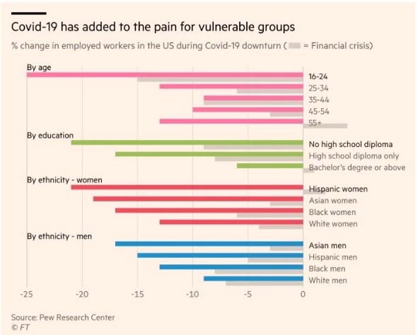 Δεύτερον, έπληξε περισσότερο τις γυναίκες από τους άντρες και τους ανειδίκευτους εργαζομένους από τους ειδικευμένους. Τούτο εξηγείται από τα σχετικά υψηλά ποσοστά γυναικείας απασχόλησης σε κάποιους τομείς που δέχθηκαν ισχυρό πλήγμα και τη δυνατότητα μιας μεγάλης μερίδας ειδικευμένων εργαζομένων να δουλέψουν με ασφάλεια από το σπίτι.