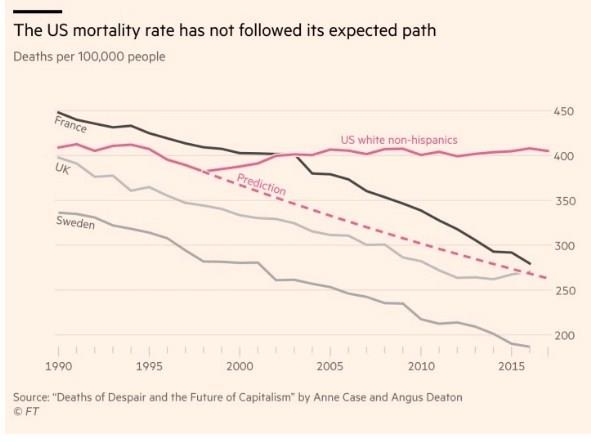 Στο Deaths of Despair and the Future of Capitalism, η Αν Κέις και ο Άνγκους Ντίτον υποστηρίζουν ότι οι εξελίξεις αυτές έχουν προκαλέσει σε πολλούς σοβαρά προβλήματα υγείας. Επισημαίνουν ότι τα ποσοστά θνησιμότητας των λευκών μεσήλικων Αμερικανών έχουν αυξηθεί μετά το 2000. Κάτι παρόμοιο φαίνεται να συμβαίνει τελευταία και στο Ηνωμένο Βασίλειο. «Οι θάνατοι της απόγνωσης», υποστηρίζουν, «είναι φαινόμενο που εμφανίζεται μεταξύ όσων έχουν μείνει πίσω, εκείνων των οποίων οι ζωές δεν εξελίχτηκαν όπως ανέμεναν».