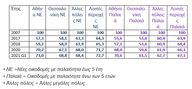 Αν μελετήσουμε την πορεία της αγοράς κατοικιών μέσω των δεικτών της τράπεζας της Ελλάδος θα δούμε ότι το υψηλό σημείο ήταν το 2007 όπου ο δείκτης ήταν 100. Στην δεκαετή κρίση της οικονομίας, το 2017 ο δείκτης έφτασε στο χαμηλότερο σημείο και έκτοτε άρχισε η σταδιακή άνοδος των τιμών, όπως φαίνεται στον πίνακα που ακολουθεί.