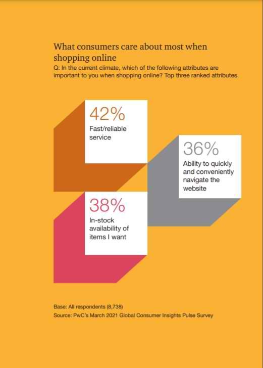 Σε αυτό το νέο σκηνικό αγορών, που διαμορφώνεται, το θέμα της παράδοσης των προϊόντων αναδεικνύεται σε μείζον ζητούμενο. Σύμφωνα με την έρευνα, όταν οι καταναλωτές ερωτώνται τι θεωρούν πιο σημαντικό κατά τη διαδικασία των online αγορών σε ποσοστό 42% απαντούν η γρήγορη και αξιόπιστη παράδοση των προϊόντων. Το δεύτερο πιο σημαντικό στοιχείο κατά τις ψηφιακές αγορές είναι η διαθεσιμότητα των προϊόντων (με 38%), ενώ το τρίτο είναι η γρήγορη και εύκολη περιήγηση στο site της εμπορικής επιχείρησης.