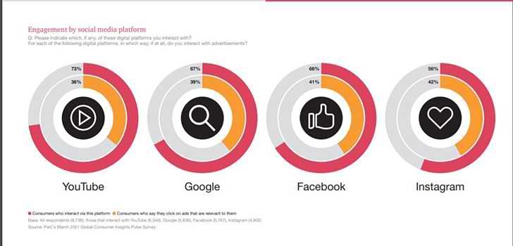 Η πανδημία της COVID-19 εκτός από τη στενότερη σχέση του καταναλωτή με το online κανάλι αγορών, έκανε ακόμη πιο έντονη την αλληλεπίδρασή του με τις ψηφιακές πλατφόρμες όπως το YouTube, το Google, το Facebook και το Instagram. Σύμφωνα με την έρευνα, η πλατφόρμα με την οποία αλληλοεπιδρούν περισσότερο οι καταναλωτές είναι το YouTube (73%), ακολουθεί το Google (67%), το Facebook (66%) και το Instagram (56%).