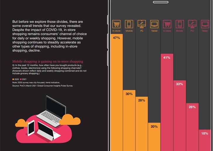 Παρά τον αντίκτυπο του COVID-19 στο λιανικό εμπόριο, οι αγορές εντός του καταστήματος φαίνεται να παραμένουν η κορυφαία επιλογή για καταναλωτές, που ψωνίζουν καθημερινά ή εβδομαδιαία. Έτσι, σήμερα το 47% δηλώνει ότι προτιμά να αγοράζει από φυσικά καταστήματα, ενώ το 41% απαντά ότι προτιμά το online κανάλι αγορών.