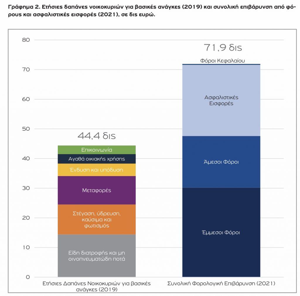 Σύμφωνα με την έρευνα, η συνολική επιβάρυνση πολιτών και επιχειρήσεων από φόρους και ασφαλιστικές εισφορές το 2021 είναι σχεδόν διπλάσια από το ποσό που καταβάλλουν τα νοικοκυριά για την κάλυψη των βασικών τους αναγκών. αναγκών καθώς ανέρχεται σε 71,9 δις ευρώ έναντι και 44,4 δις ευρώ που ήταν το 2019 η συνολική δαπάνη για διατροφή, ένδυση, στέγαση, οικιακά αγαθά, μεταφορές και επικοινωνίες, σύμφωνα με πρόσφατη έρευνα της ΕΛΣΤΑΤ).