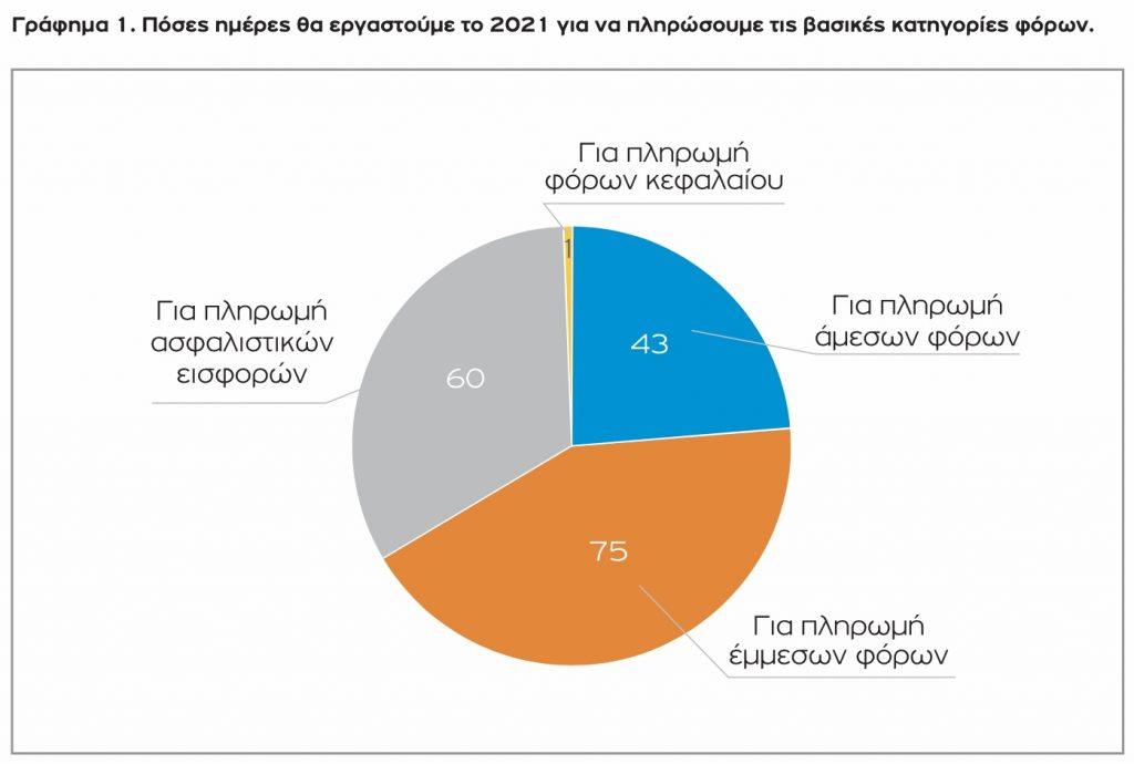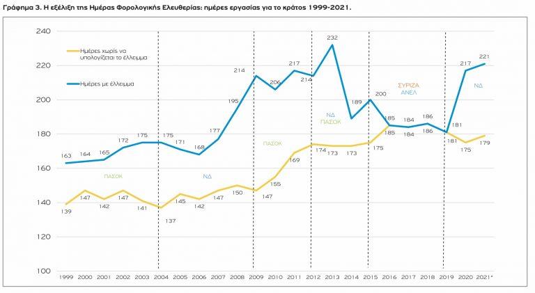 – Την εικοσαετία από το 1999 έως το 2018 προστέθηκαν 47 παραπάνω ημέρες εργασίας για το κράτος. Το 1999 εργαστήκαμε 139 ημέρες, το 2012 174 ημέρες, ενώ το 2018 φτάσαμε τις 186 ημέρες εργασίας για να πληρωθούν οι φόροι και οι εισφορές. Το διάστημα 2019-2020 καταγράφεται η πρώτη σημαντική πτώση της τελευταίας εικοσαετίας, κατά 11 ημέρες, και το 2021 αύξηση τεσσάρων ημερών.