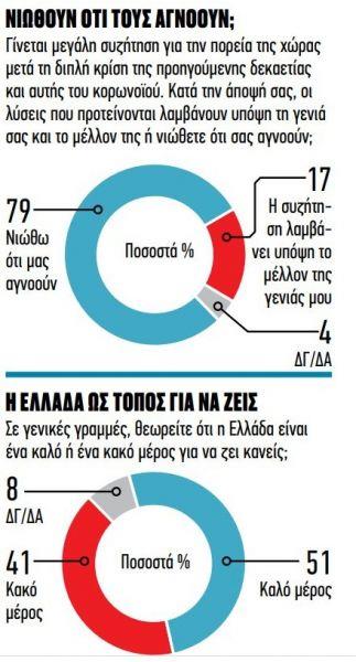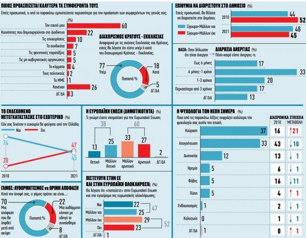 Η Ελλάδα θεωρείται ένα καλό μέρος για να ζει κανείς (51%) και η ισχύς της στον κόσμο πηγάζει από τη γεωπολιτική βαρύτητα της θέσης της στον χάρτη, την πολιτισμική κληρονομιά και την Ιστορία, τους τουριστικούς προορισμούς, το κλίμα, το φυσικό περιβάλλον και τους φυσικούς πόρους. Από τη διαχρονική προίκα της, με άλλα λόγια, και όχι από τα δημιουργήματα των επιγόνων της όπως οι υποδομές, οι δομές, οι θεσμοί της Πολιτείας και το έμψυχο δυναμικό που τα λειτουργεί και τα νοηματοδοτεί. Εμπιστεύονται περισσότερο τον Στρατό (45%), τις ιδιωτικές επιχειρήσεις (35%) και τα μέσα κοινωνικής δικτύωσης (32%), ενώ δημόσια διοίκηση (13%), πολιτικά κόμματα (11%) και ΜΜΕ (6%), βρίσκονται σταθερά και για περισσότερο από 10 χρόνια στην κατώτερη κλίμακα του δείκτη εμπιστοσύνης.