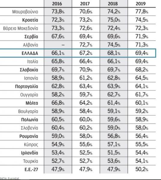 Στην Ελλάδα και στην Ιταλία, το αντίστοιχο ποσοστό είναι 69,4%, μία αύξηση κατά 8,7 μονάδες από το 2011, ενώ στις χαμηλότερες θέσεις κατατάσσονται σκανδιναβικές και βορειοευρωπαϊκές χώρες, όπως η Δανία με 17,2% και η Φινλανδία με 19,5%.