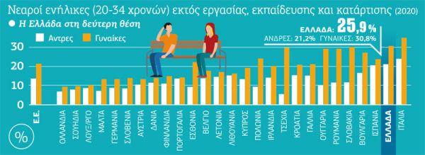 Σύμφωνα με τα στοιχεία για τους νέους χωρίς πρόσβαση στην εργασία, την εκπαίδευση και την κατάρτιση (Νο Employment, Education, Training – ΝΕETs) για το 2020, η Ελλάδα κατατάσσεται στη δεύτερη υψηλότερη θέση στην Ε.Ε. με ποσοστό 25,9%, πίσω μόνο από την Ιταλία (29,4%).