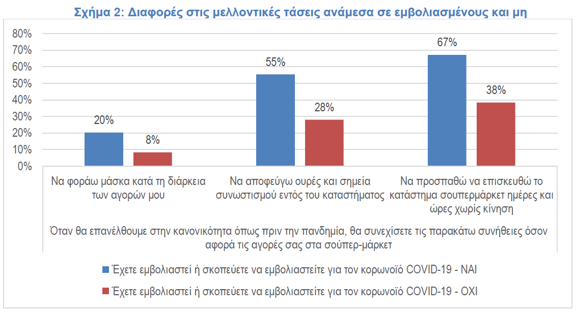 Όπως καταγράφεται στο σχήμα 1, υπάρχουν σημαντικές διαφορές στις αγοραστικές συνήθειες ανάμεσα στο κοινό που έχει εμβολιαστεί (ή σκοπεύει να εμβολιαστεί) το οποίο αντιπροσωπεύει το 68% του συνόλου και στο κοινό της έρευνας που δεν έχει εμβολιαστεί (και δεν σκοπεύει να εμβολιαστεί), το οποίο αντιπροσωπεύει το 32% του συνόλου του κοινού της έρευνας.