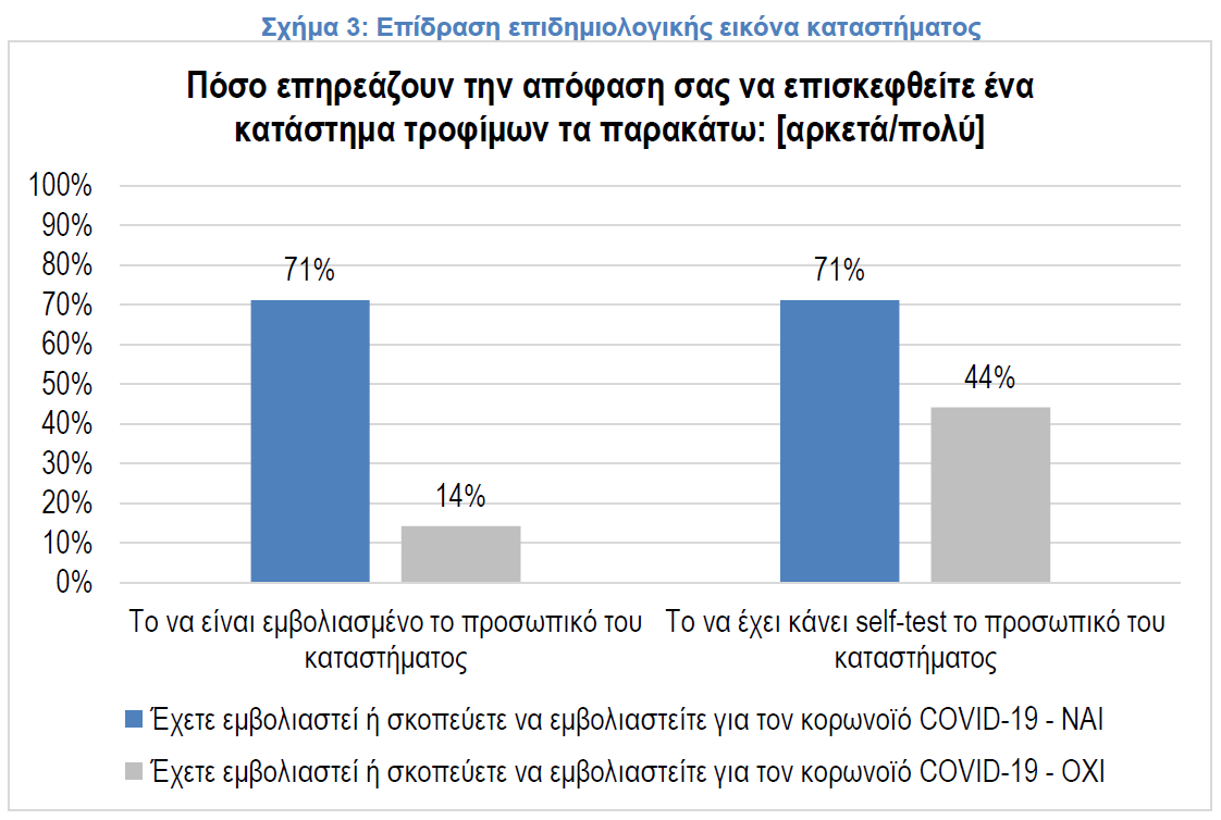 Στο σχήμα 3 καταγράφεται η επίδραση που έχει η επιδημιολογική εικόνα των καταστημάτων στην απόφαση των καταναλωτών να αγοράσουν από αυτά. Φαίνεται ότι είναι σημαντικά εντονότερη η επιθυμία του εμβολιασμένου κοινού (το οποίο σημειώνεται και πάλι ότι αποτελεί το 68% του συνόλου) να είναι εμβολιασμένο το προσωπικό του καταστήματος, με το 71% να δηλώνει ότι είναι αρκετά ή πολύ σημαντικός παράγοντας για να επισκεφθούν ένα κατάστημα τροφίμων. Ίδιο ποσοστό 71% δηλώνει ότι επιθυμεί το προσωπικό των καταστημάτων τροφίμων να υποβάλλεται σε σελφ-τεστ. Τα αντίστοιχα ποσοστά στο κοινό των μη εμβολιασμένων είναι μόλις 14% για τον εμβολιασμό του προσωπικού και 44% για την υποβολή σε σελφ-τεστ.