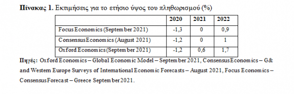 Ο Πίνακας 1 παρουσιάζει τις πιο πρόσφατες εκτιμήσεις της Oxford Economics, της Focus Economics και της Consensus Economics σχετικά με το αναμενόμενο ύψος του πληθωρισμού για το 2021 και το 2022 για την Ελλάδα.