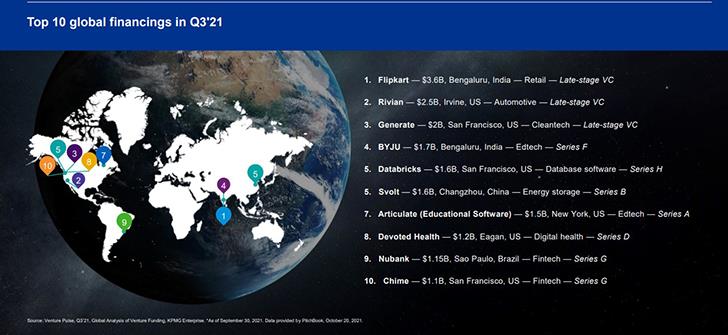 Η ινδική Flipkart άντλησε $3,6 δισ. στη μεγαλύτερη συναλλαγή του 3ου τριμήνου 2021, με τις αμερικανικές Rivian ($2.5 δισ.) και Generate ($2 δισ.) να ακολουθούν. Άλλες εταιρείες με γύρους χρηματοδότησης άνω του $1 δισ. περιλαμβάνουν την Byju με έδρα στην Ινδία ($1,7 δισ.), Databricks στις ΗΠΑ ($1,6 δισ.), Svolt στην Κίνα ($1,58 δισ.), Articulate στις ΗΠΑ ($1,5 δισ.) Devoted Health στις ΗΠΑ ($1,2 δισ.), Nubank στη Βραζιλία ($1,1 δισ.), Chime στις ΗΠΑ ($1,1 δισ.) και GoPuff στις ΗΠΑ ($1 δισ.).
