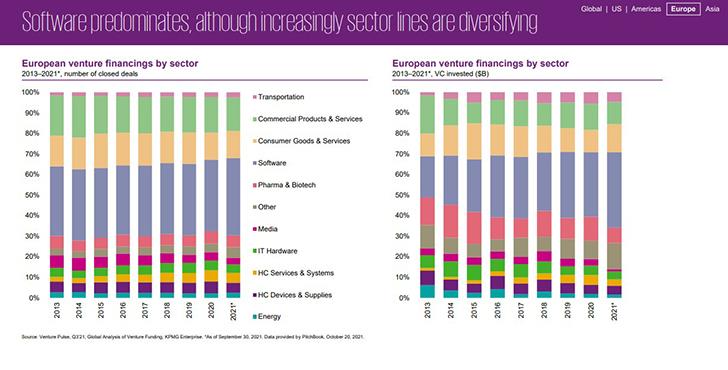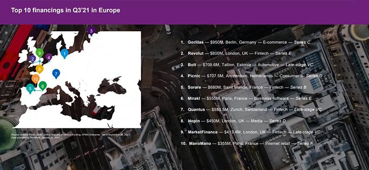 Το 3ο τρίμηνο 2021, οι πέντε μεγαλύτερες συναλλαγές πραγματοποιήθηκαν σε πέντε διαφορετικές περιφέρειές - με την γερμανική Gorillas να συγκεντρώνει $950 εκατ., ακολουθούμενη από τη βρετανική Revolut ($800 εκατ.), την εσθονική Bolt ($709 εκατ.), την ολλανδική Picnic ($707 εκατ.) και τη γαλλική Sorare ($680 εκατ.).