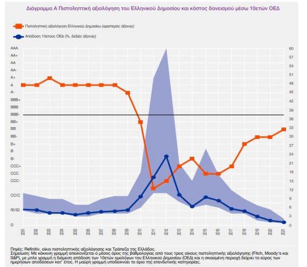 Από τα τέλη του 2020, οι τρεις από τους προαναφερθέντες τέσσερις οίκους αξιολόγησης, που είναι αποδεκτοί από το Ευρωσύστημα ως εξωτερικοί οργανισμοί αξιολόγησης πιστοληπτικής ικανότητας (External Credit Assessment Institutions ? ECAIs), έχουν αναβαθμίσει το Ελληνικό Δημόσιο κατά μία βαθμίδα (notch). Ταυτόχρονα, οι δύο από τους τρεις οίκους (DBRS και S&P) διατηρούν θετικές προοπτικές (positive outlook), γεγονός που, σύμφωνα με τις δημοσιευμένες μεθοδολογίες τους, υποδηλώνει αυξημένη πιθανότητα για περαιτέρω αναβάθμιση εντός των επόμενων 12-18 μηνών, μετά την τελευταία αξιολόγηση.