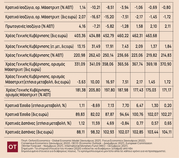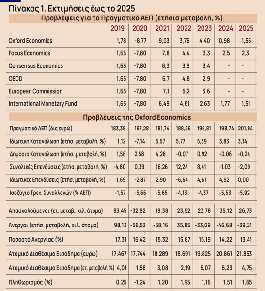 Στις νε?ες της προβλε?ψεις με βάση τα στοιχεία του Ιανουαρίου, η Oxford Economics βελτίωσε την εκτίμησή της για το 2021 καθώς εκτιμα? ο?τι ο πραγματικο?ς ρυθμο?ς μεγε?θυνσης στην Ελλα?δα αναμε?νεται να διαμορφωθει? στο 9% το 2021 (απο? 8,47% που εκτιμούσε το Δεκέμβριο). Η εκτίμηση για το 2022 αυξήθηκε στο 3,76% (από 3.42% που εκτιμούσε το Δεκέμβριο) ενώ για το 2023 η εκτιμά ότι ο ρυθμός θα αυξηθεί κατά 4,4% (απο? 4,35% που εκτιμούσε το Δεκέμβριο). Τέλος, για το 2024 η εκτίμηση παραμένει σταθερή στο 0,98% και για το 2025 η εκτίμηση αφορά σε ένα ρυθμό μεγέθυνσης της τάξης του 1,56%.