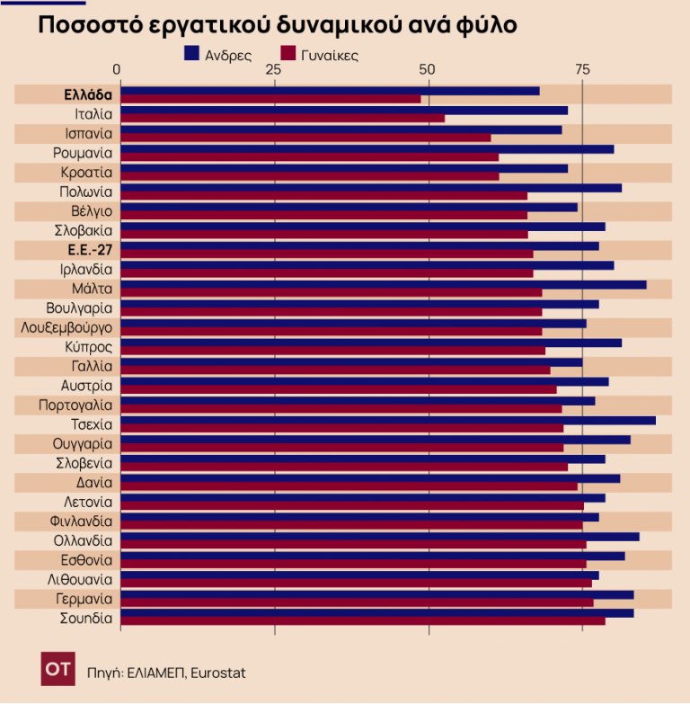 Αντίθετα, όσον αφορά την γυναικεία απασχόληση, τα πράγματα είναι πολύ λιγότερο ρόδινα: στη χώρα μας είναι η χαμηλότερη της Ευρώπης (βλ. γράφημα). Το 2019, μόλις 48,7% των γυναικών ηλικίας 20-64 ετών εργάζονταν στην Ελλάδα, όταν για τους άνδρες το αντίστοιχο ποσοστό ανερχόταν σε 68,1%.