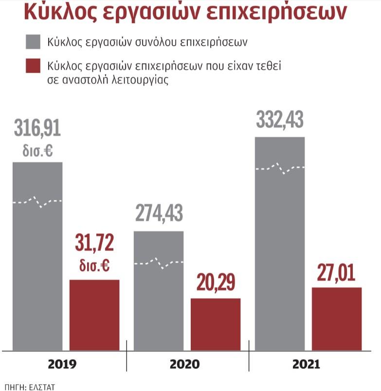 Σύμφωνα με τα στοιχεία της Ελληνικής Στατιστικής Αρχής (ΕΛΣΤΑΤ), ο τζίρος των επιχειρήσεων στο σύνολο της ελληνικής οικονομίας διαμορφώθηκε το 2021 σε 332,43 δισ. ευρώ, υψηλότερος όχι μόνο αυτού του 2020, κάτι άλλωστε που ήταν αναμενόμενο, αλλά και του τζίρου του 2019. Συγκεκριμένα, ο κύκλος εργασιών των επιχειρήσεων στο σύνολο της ελληνικής οικονομίας ήταν 316,91 δισ. το 2019 και 274,43 δισ. ευρώ το 2020. Με άλλα λόγια, ο τζίρος των επιχειρήσεων στην Ελλάδα τη δεύτερη χρονιά της ζωής μας με την πανδημία ήταν μεγαλύτερος κατά 15,52 δισ. ευρώ ή κατά 4,9% σε σύγκριση με την τελευταία χρονιά πριν από την εμφάνιση της COVID-19. «Πρόκειται για ακόμη μια θετική εξέλιξη, που αποτυπώνει όχι μόνο την ανθεκτικότητα των ελληνικών επιχειρήσεων εν μέσω πανδημίας, αλλά και τη δυναμική που αυτές έχουν αποκτήσει χάρη στην προσαρμοστικότητά τους και τη γενναία κρατική στήριξη που τους έχει παρασχεθεί καθ’ όλη αυτή τη δύσκολη περίοδο», σχολίασε ο υπουργός Οικονομικών Χρ. Σταϊκούρας. Σε ό,τι αφορά τη στήριξη των επιχειρήσεων, αξίζει εδώ να σημειωθεί ότι μόνο σε ό,τι αφορά την επιστρεπτέα προκαταβολή, που δόθηκε όχι μόνο σε επιχειρήσεις των οποίων η λειτουργία ανεστάλη, αλλά σε σειρά άλλων δραστηριοτήτων που επλήγησαν στη διάρκεια της πανδημίας από τη μείωση της ζήτησης, από το συνολικό ποσό των 8,3 δισ. ευρώ, εισπρακτέα θα είναι μόνο τα 2,3 δισ. ευρώ.