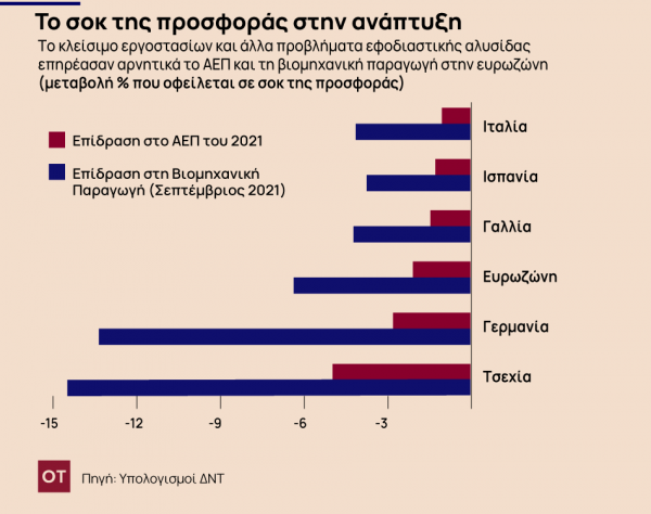Οι υπολογισμοί του ΔΝΤ είναι αποκαλυπτικοί. Σύμφωνα με αυτούς, η βιομηχανική παραγωγή της ζώνης του ευρώ το φθινόπωρο του 2021 θα ήταν περίπου 6% υψηλότερη χωρίς τους περιορισμούς στην προσφορά. Επίσης με βάση την ιστορική συσχέτιση μεταξύ της μεταποίησης και της συνολικής παραγωγής εκτιμάται πως το ακαθάριστο εγχώριο προϊόν θα ήταν περίπου 2 τοις εκατό υψηλότερο, ποσοστό ισοδύναμο με την αξία ανάπτυξης ενός έτους σε κανονικές προ-πανδημικές περιόδους για πολλές ευρωπαϊκές οικονομίες, εκτιμάται ακόμη.