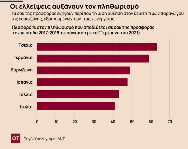 Οι περιορισμοί της προσφοράς έπαιξαν επίσης σημαντικό ρόλο στην τροφοδότηση του πληθωρισμού των τιμών παραγωγού στη ζώνη του ευρώ, αλλά το ίδιο έκανε και η ισχυρή ζήτηση, σημειώνεται. Η συμμετοχή της βιομηχανίας στη συνιστώσα του πληθωρισμού των τιμών παραγωγού ήταν περίπου 9 ποσοστιαίες μονάδες υψηλότερη σε σχέση με το διάστημα πριν από την πανδημία για τα τρία πρώτα τρίμηνα του 2021, όπως εκτιμά το ΔΝΤ. «Εκτιμούμε ότι οι κρίσεις προσφοράς μπορούν να εξηγήσουν περίπου το ήμισυ της αύξησης του πληθωρισμού των τιμών των μεταποιημένων αγαθών. Τα υπόλοιπα εξηγούνται κυρίως από την αυξημένη ζήτηση», αναφέρεται.